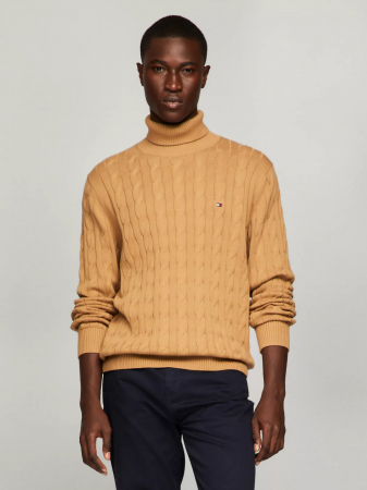 Tommy Hilfiger men's sweater. Made from soft cotton in a textured cable knit weave, this turtleneck sweater is the perfect layer, complete with rib-knit cuffs, collar and hem with touches of subtle branding throughout.