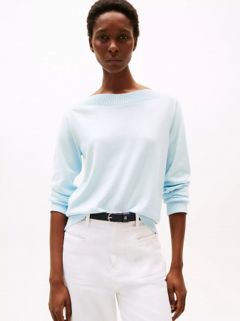 Tommy Hilfiger women's sweater. Our premium cotton boatneck sweater takes on a soft, textured feel thanks to the wide-rib trim accents at the neckline, cuffs and hem.