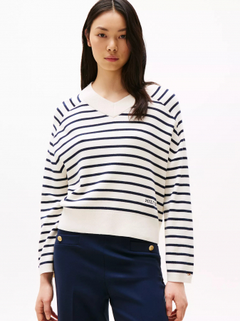 Tommy Hilfiger women's sweater. Simplicity never goes out of style. Our timeless cotton sweater is designed with a V-neck, fresh mini stripes and our logo at the waist.