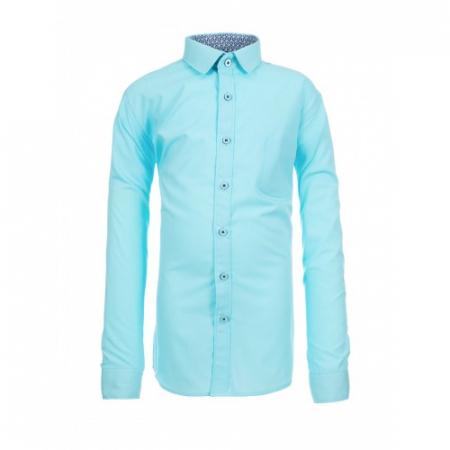 Состав: 55% хлопок, 45% полиэстер. Цвет бирюзовый. Отделка контрастной тканью по вороту, планке и на манжетах. Крой прямой. Длинный рукав. Товар сертифицирован.