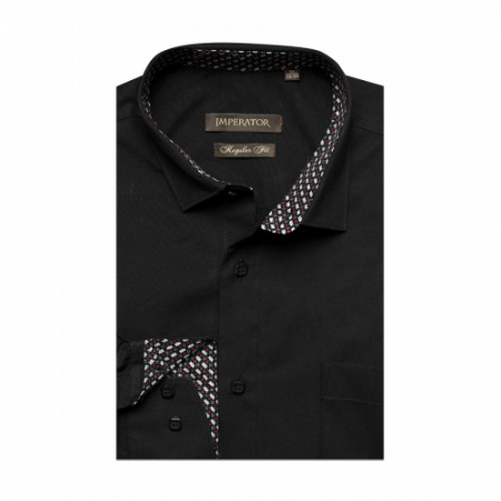 Модель прямого кроя, комбинированная контрастной тканью по внутренним вороту и манжетам. Цвет черный. Длинный рукав. Товар соответствует техническому регламенту о безопасности продукции легкой промышленности.