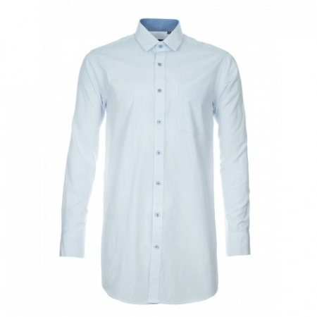 Модель с накладным нагрудным карманом, комбинированная контрастной тканью по внутренним вороту и манжетам. Цвет белый (полоска). Крой прямой. Длинный рукав. Товар соответствует техническому регламенту о безопасности продукции легкой промышленности.
