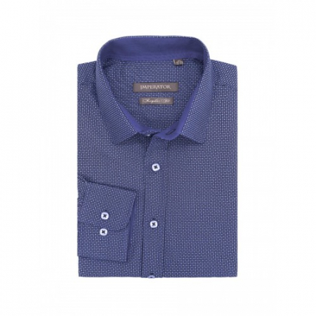 Цвет: синий. Рисунок: классический принт. Отделка контрастной тканью по вороту, планке и на манжетах.