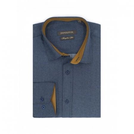 Цвет: синий. Рисунок: классический принт. Отделка контрастной тканью по вороту, планке и на манжетах.