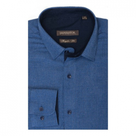 Модель прямого силуэта, комбинированная контрастной тканью по внутренним вороту и манжетам. Цвет синий (мелкая клетка). Длинный рукав. Товар соответствует техническому регламенту о безопасности продукции легкой промышленности.