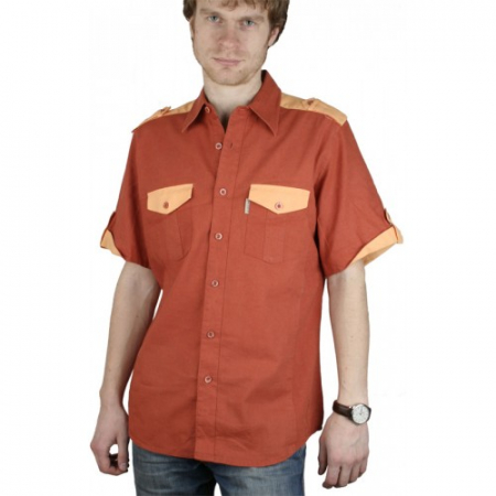 Модель прямого кроя с двумя накладными нагрудными карманами. Цвет кирпичный с оранжевыми вставками. Короткий рукав. Товар соответствует техническому регламенту о безопасности продукции легкой промышленности.