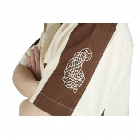 Модель прямого кроя с накладным нагрудным карманом. Цвет бежевый с коричневыми вставками. Короткий рукав. Товар соответствует техническому регламенту о безопасности продукции легкой промышленности.