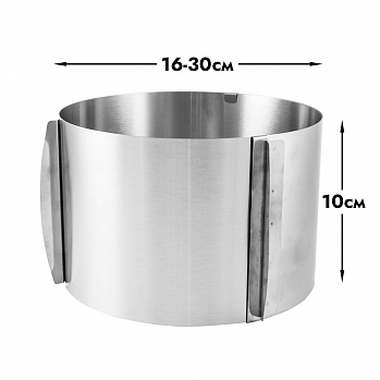 Заменит сразу несколько колец благодаря регулируемому размеру от 16 до 30 см. Легко выставить нужный диаметр благодаря удобным ручкам, плотному зажиму и разметке по внутренней части формы.