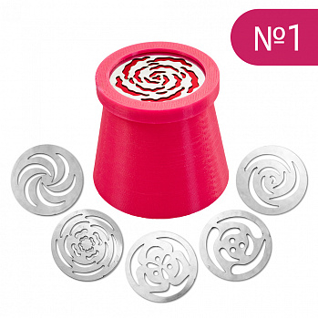 Насадка кондитерская (комплект переходник адаптер + 5 сменных дисков) для изготовления больших цветов из зефира, белкового крема и меренги. Возможность сменить насадку в процессе работы позволяет сделать букет более разнообразным и интересным!