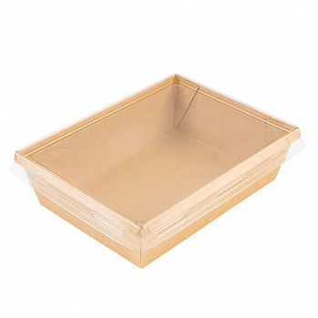 Универсальная упаковка с прозрачной плоской крышкой. Бокс изготовлен из экологически безопасного растительного сырья, которое надежно удерживает жир и влагу. Подходит для разогрева в микроволновой печи, без крышки.