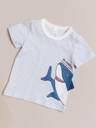 Футболка для мальчика c коротким рукавом в полоску с принтом в виде акулы. Стильная футболка из супрема пенье для летнего отдыха и повседневной носки. Круглая горловина на кнопках. Футболка подойдет для малышей от 3 месяцев до 2 лет.