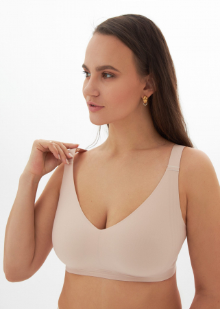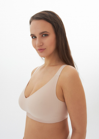 Бесшовный бюстгальтер больших размеров с мягкой чашечкой. Модель выполнена без косточек по новейшей технологии из единого инновационного полотна с кружевом, хорошо поддерживает большую грудь, благодаря широкой спинке и широким бретелям. Данная модель отличается максимальным комфортом и более глубоким V-образным вырезом. В комплекте идет расширяющая вставка для дополнительного объема.