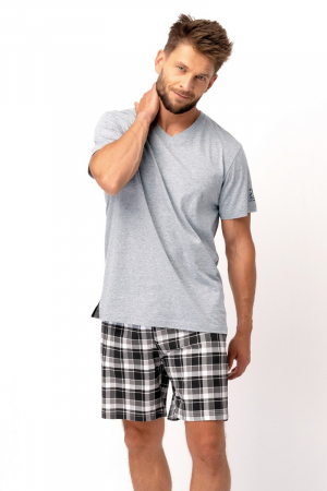 Мужская пижама с футболкой и шортами. Комфортная и приятная на ощупь пижама из 100% хлопка. Футболка с коротким рукавом и V-образным вырезом горловины, по бокам разрезы. Комфортные шорты свободного кроя с эластичным поясом. Глубокие карманы по бокам.