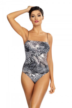 Сплошной купальник L4419/1 от европейского производителя LORIN. Бюст с мягким лифом. Тонкие несъемные бретели. Ткань с оригинальным животным принтом, с блеском.
