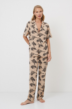 Представляем вашему вниманию длинную пижаму Soraya. Отправляйтесь в стильное и комфортное путешествие с этим очаровательным комплектом. Пижама сшита из лёгкой вискозной ткани с леопардовым принтом. Рубашка на пуговицах с короткими рукавами имеет V-образный округлый воротник и прямую нижнюю часть, украшенную завораживающей карамельной окантовкой по краю воротника, рукавов и нижней части. Брюки прямого кроя имеют эластичную талию с регулируемой кулиской и дополнены карамельной окантовкой по нижнему краю, что дополняет образ в стиле сафари. Отправляйтесь навстречу приключениям и раскройте в себе исследователя в длинной пижаме Soraya, где комфорт идеально сочетается с шиком в стиле сафари.