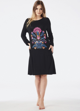 Сорочка женская для дома и отдыха LHD 585 18/19 из мягкого и шелковистого вискозного трикотажа. Многоцветный принт в народном польском стиле. Рукав закатывается, с фиксатором на пуговицу. Дополняют модель прорезные карманы.