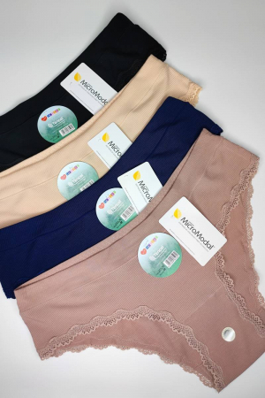 Трусики слипы из нежного модала в рубчик. По бокам вставки из эластичного кружева. Классическая посадка. В упаковке 12 штук. Размеры в упаковке (S-3шт, M-6шт, L-3шт), различные цвета.