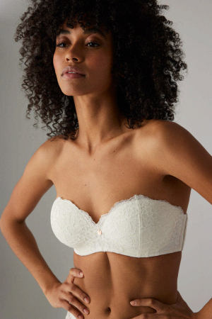 Кружевной бюстгальтер с чашкой на тонком поролоне. Стан с вертикальной костью. Его съемные бретельки позволяют использовать несколько положений, адаптируясь к разным стилям. Бюстгальтер с боковой застежкой, он идеально подходит для одежды с открытой спиной, становясь идеальным выбором для невесты в ее свадебном образе.