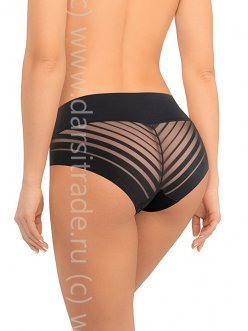 Трусы макси-слип с высокой линией талии. Передняя деталь выполнена из мягкой микрофибры, задняя деталь - из декоративного полотна с чередующимися полосками разной ширины. Спереди вырез ножки обработан с использованием технологии "лазерный край". Линия талии проклеена вподгибку. Хлопковая ластовица притачана к изделию потайным швом. Благодаря особенностям обработки материалов изделие абсолютно незаметно под одеждой.