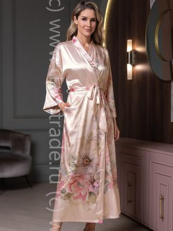 Длинный запашной халат Mia-Amore с рукавами длиной 7/8 выполнен из смесового принтованного шёлка. В боковых швах удобные карманы, халат завязывается на талии съёмным поясом.