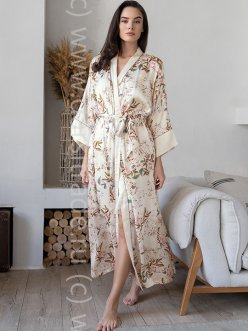 Длинный запашной халат-кимоно Mia-Amore с широким рукавом длиной 3/4. Изделие выполнено из принтованного смесового шелка с однотонной отделкой по бортам и низу рукавов. По бокам обработаны карманы.