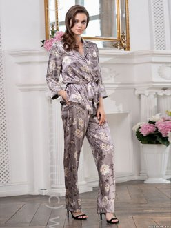 Элегантный комплект-двойка Mia-Amore из смесового шелкового полотна с изящным принтом, состоит из жакета на пуговицах и брюк, по краю борта и рукавов жакета – контрастный атласный кант, на груди маленький декоративный кармашек.