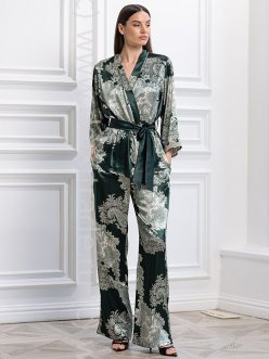 Комплект-тройка состоит Mia-Amore из жакета с рукавом длиной ?, брюк и топа на тонких бретелях, выполнен из принтованного смесового шелка насыщенного изумрудного оттенка. Низ рукавов жакета и лиф топа декорированы ажурным кружевом молочного цвета. В боковых швах брюк обработаны карманы. Линию талии можно подчеркнуть за счет пояса, который идет в комплекте.