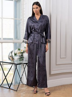 Комплект Mia-Amore состоит жакета и широких брюк. Изделия комплекта выполнены из принтованного смесового шелка. Линию талии можно подчеркнуть за счет широкого пояса, который идет в комплекте.