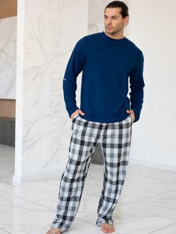 Мужской домашний костюм с брюками и футболкой с длинным рукавом – идеальная одежда для прохладного времени года. Свободные прямые клетчатые брюки из мягкого трикотажа с лёгким ворсом необыкновенно уютны. Пояс на резинке, удобные боковые карманы. Лонгслив выполнен из нежнейшей ткани с содержанием вискозы. Классический силуэт, длинный рукав, округлый вырез горловины, благородные варианты расцветок: винно-красный или цвет индиго – позволяют носить верх от костюма не только дома.