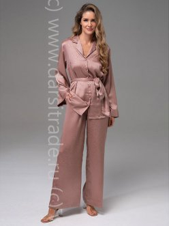 Комплект Mia-Amore выполнен из однотонного искусственного шелка на жаккардовой основе. Комплект состоит из брюк и жакета с длинными рукавами и центральной застежкой на пуговицы. В боковых швах брюк расположены карманы. Линия талии подчеркивается за счет широкого пояса.