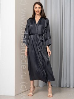 Длинный запашной халат Mia-Amore с длинным широким рукавом. Изделие выполнено из однотонного искусственного шелка на жаккардовой основе в виде широких полос, которые имеют горизонтальное и вертикальное расположение на деталях кроя. В боковых швах изделия расположены карманы. Линию талии подчеркивает широкий пояс.