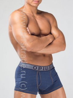 Мягкие комфортные мужские боксеры цвета джинс в меланжевую полоску, с контрастной отстрочкой, имитирующей классический джинсовый шов. Плотная, сохраняющая форму резинка с оригинальным логотипом Opium.