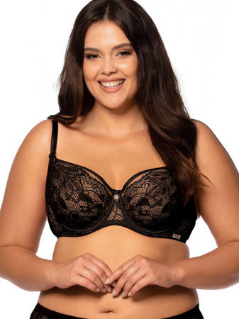 Бюстгальтер Victoria M на косточках, чашки мягкие, с боковой корректирующей сеткой, шитые из гипюра, продублированы телесной сеткой. Бретельки пришиты, регулируются по длине. Спинка из микрофибры. На спине застёжка на удлинитель, фурнитура металлическая цвета желтого золота.
