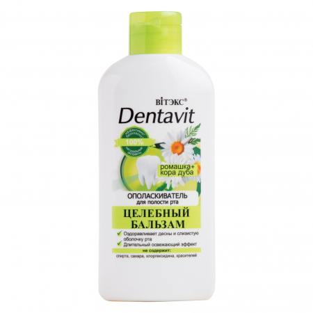 Состав: вода, глицерин, ПЭГ-40 гидрогенизированное касторовое масло, экстракт Chamomilla Recutita (ромашки), экстракт коры Quercus Robur (дуба), метилпарабен, лаурилсульфат натрия, ароматизатор, гидрокарбонат натрия, фторид натрия, триклозан, пропилпарабен, 2-бром-2-нитропропан-1,3-диол, сахаринат натрия, лимонная кислота