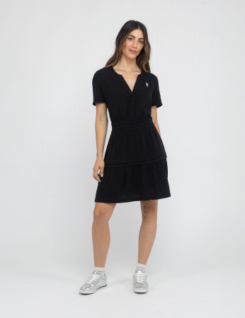 Brighten your wardrobe with the Smocked Waist Tiered Dress from U.S. Polo Assn. This breezy dress features a lightweight crinkled texture that moves beautifully with every step. The smocked waist cinches for a flattering silhouette, while the tiered skirt and short sleeves keep it playful and feminine. An embroidered logo at the chest adds a subtle heritage touch.