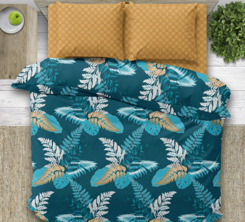Яркий и насыщенный дизайн с растительными мотивами добавляет свежести и гармонии в интерьер. Пододеяльник выполнен из основной ткани, а простыня и наволочки — из ткани-компаньона, что создает идеальное сочетание текстур и цветов.