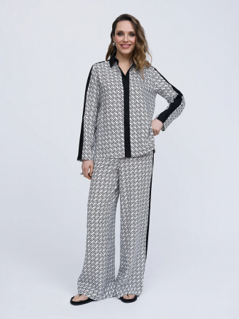 Эта женская рубашка с принтом в оттенке «слоновая кость» выполнена из 100% тенсела — материала, известного своей мягкостью, дышащими свойствами и устойчивостью. Модель имеет прямой свободный крой и классический отложной воротник, а черная планка с пуговицами и контрастные вставки на плечах и рукавах придают образу графичность и визуальную стройность. Принт в виде переплетающихся геометрических элементов добавляет динамичности и делает вещь актуальной как для офиса, так и для неформальных встреч.