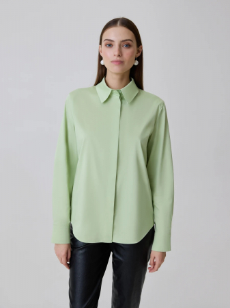 Такой вариант классической прямой рубашки непременно освежит гардероб и разбавит его новыми красками. Нежный салатовый оттенок в сочетании с деликатным сатиновым финишем делает модель ярким акцентом любого образа. Длинные свободные рукава со сборками на манжетах застегиваются на круглые пуговицы в тон. Сама же рубашка застегивается на ряд потайных пуговиц - этот дизайнерский прием не нагружает изделие деталями и сохраняет лаконичность.