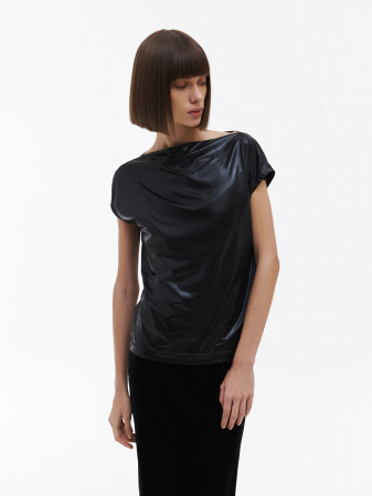 Элегантная вечерняя блуза с коротким рукавом выполнена из блестящей ткани в черном цвете. По всему изделию проходит хаотичная драпировка и образует мягкие складки. Благодаря особенностям ткани они переливаются на свету, образуя динамичный свето-теневой рисунок. Еще один интересный акцент - вырез «лодочка». Полная длина позволяет заправлять блузку в брюки или юбку, что открывает горизонты для большого количества разных по настроению образов.