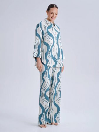 Женские брюки свободного кроя с абстрактным бирюзовым принтом — расслабленная и универсальная модель, подходящая как для повседневных, так и для более собранных образов. Прямые широкие брючины мягко струятся при движении, создавая лёгкий и женственный силуэт. Пояс с эластичной вставкой сзади обеспечивает комфортную посадку без ощущения стянутости.