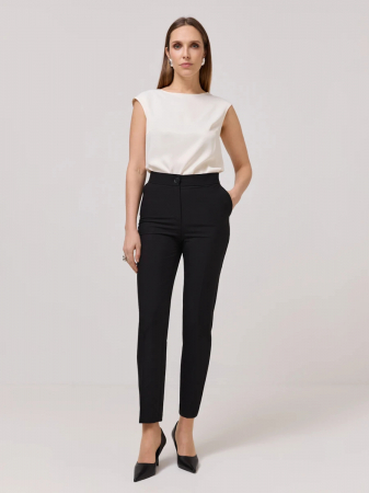 Женские укороченные брюки в классическом чёрном цвете — идеальный выбор для тех, кто ценит стиль, лаконичность и комфорт в деловом гардеробе. Благодаря высокой посадке и зауженному силуэту, модель подчёркивает линию талии и визуально вытягивает силуэт. Чистый крой дополнен стрелками и прорезными карманами сзади, создавая элегантный и утончённый образ. Застёжка на потайную молнию и пуговицу делает посадку надёжной, а плотный материал держит форму в течение всего дня.
