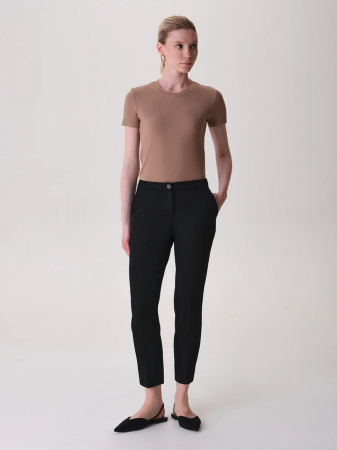 Классические женские брюки зауженного силуэта со стрелками в черном цвете. Полуприлегающий крой не сковывает движения, а удобная средняя посадка обеспечивает комфортную носку. Длина изделия 7/8 очень удобна для сочетания с любым типом обуви. Такую модель можно смело сочетать как с кроссовками и кедами, так и с высокими ботинками. На задней части брюк снизу расположены аккуратные разрезы, зрительно вытягивающие силуэт в сочетании с заутюженными стрелками по всей длине. Имеются функциональные передние и задние карманы.
