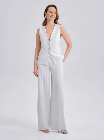 Женский жилет голубого оттенка — элегантная интерпретация классического элемента гардероба в актуальном минималистичном исполнении. Приталенный силуэт подчёркивает талию, создавая женственный образ, а глубокий V-образный вырез визуально вытягивает верхнюю часть фигуры. Три аккуратные пуговицы и имитация прорезных карманов придают изделию деликатную строгость, а безрукавный крой делает жилет универсальным как для офисного, так и для повседневного стиля.
