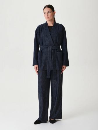 Свободный трикотажный жакет в темно-синем оттенке станет отличным дополнением стильного образа. Такая универсальная модель идеально сядет на любой тип фигуры. С помощью длинного съемного пояса в комплекте можно подчеркнуть талию и скорректировать силуэт. На передней части изделия имеются вместительные функциональные карманы, а линия воротника образует женственный V-образный вырез.