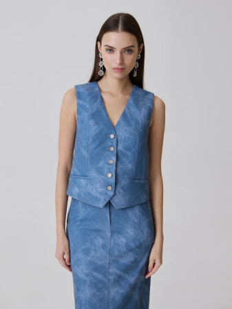 Классический укороченный жилет из экокожи в голубых тонах - идеальный вариант для любительниц ярких образов. Минималистичный дизайн с рядом из круглых металлических пуговиц и декоративными карманами удачно впишется в большое количество стильных луков. Можно сочетать изделие с однотонными лонгсливами и легкими блузами или носить в качестве самостоятельной единицы. V-образная зона декольте элегантно подчеркивает красоту шеи и ключиц, что придает наряду больше женственности и утонченности.