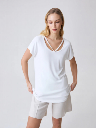 Белая трикотажная футболка свободного прямого кроя - универсальная единица любого гардероба. С ее помощью можно составить большое количество повседневных женственных луков. Модель имеет отличительную особенность в виде декоративных лент на горловине. Такой лаконичный элемент придает образу нежный и романтический характер. Глубокий овальный вырез делает акцент на зоне декольте и ключицах, а сзади открывает лопатки.