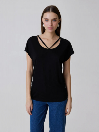Свободная трикотажная футболка в базовом черном цвете. Универсальная модель с короткими рукавами имеет глубокий овальный вырез с декоративными элементами. Спереди и сзади горловина украшена тонкими лентами из основной ткани. Футболка выполнена в стандартной длине, благодаря чему будет отлично смотреться как в заправленном виде, так и навыпуск. Лаконичный дизайн позволяет с легкостью интегрировать ее в любой гардероб для стильных и женственных образов.