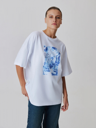 Хлопковая oversize футболка белого цвета - обязательный элемент базового гардероба в период весна-лето. С ее помощью можно без особых усилий собрать большое количество стильных и ярких образов. Объемный крой одинаково хорошо смотрится как в варианте носки навыпуск, так и в заправленном виде с джинсовыми шортами или свободными брюками. На переднюю часть футболки нанесен принт в голубых тонах с минималистичной надписью - это отличная возможность наполнить образы свежими оттенками.