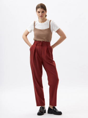 Брюки-кэррот прямого кроя насыщенного красного оттенка, на высокой посадке. Удлиняют силуэт, отлично подойдут для делового образа в комплекте с удлиненным жакетом.