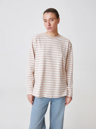 Oversize лонгслив прямого кроя - стильное и практичное решение повседневного гардероба. Модель белого цвета в горизонтальную бежевую полоску имеет длинные свободные рукава и круглую горловину. По бокам имеется аккуратный аккуратный акцент в виде небольших разрезов. Стандартная длина позволяет заправлять изделие в брюки и джинсы или носить навыпуск. Это дает возможность разнообразить образы без лишних усилий.